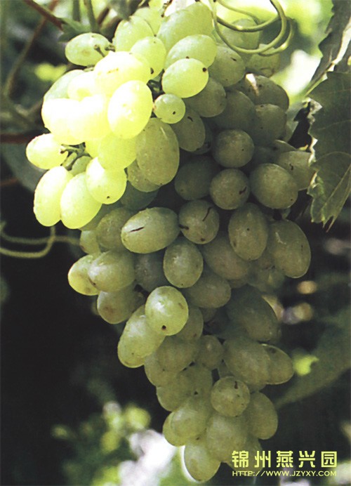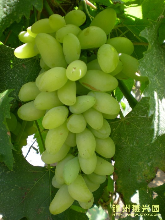 金田翡翠 果穗圆锥形,无歧肩,平均单穗重474g,果粒近圆形,果皮翠绿色一黄绿色,着色一致。果肉白色,有清香味。肉质脆,多汁,可溶性固形物含量21%,味甜。成熟期在9月中下旬,属于晚熟品种。 |